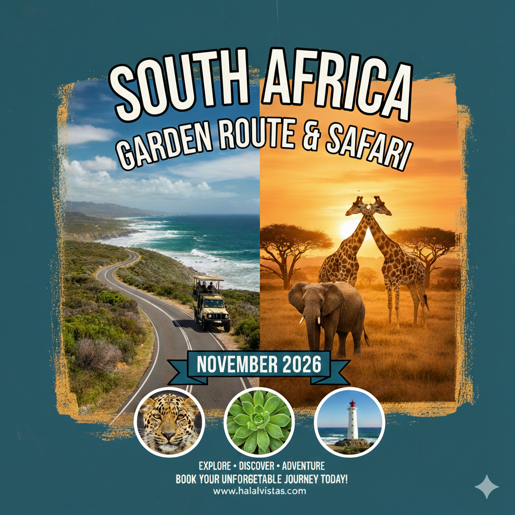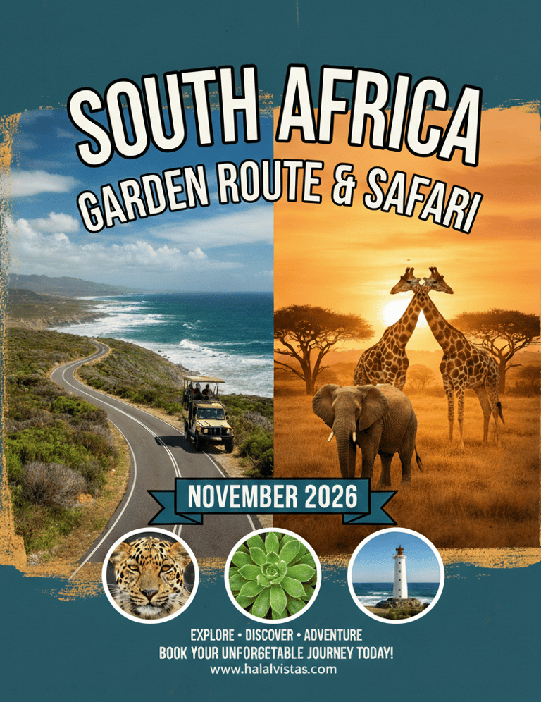 Experience an unforgettable, halal-friendly journey through Cape Town and the Garden Route in November 2026. Discover the rich Cape Malay heritage of the Bo-Kaap, enjoy a fully halal safari, and explore icons like Table Mountain with ease. Our family-focused itinerary features certified halal dining, prayer-timed breaks, and alcohol-free accommodations.